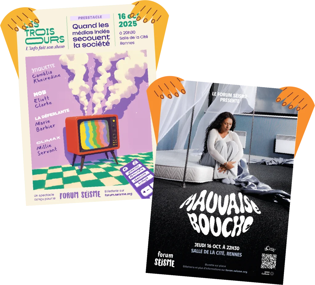Parce que l’art est une manière de s’engager ! Cette année, nous accueillons les Trois Ours, un média qui fait monter l’information sur scène en Bretagne, et Mauvaise Bouche, chanteuse pop montpelliéraine.
